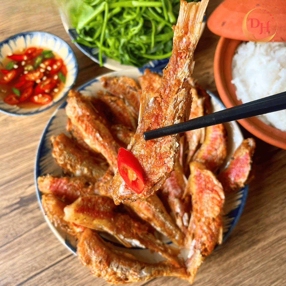 - Cá phèn hồng chiên giòn: Rán vàng hai mặt, ăn cùng cơm trắng và rau sống
